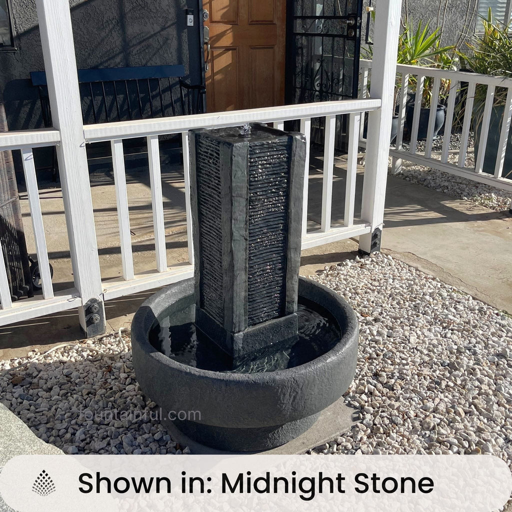 Water bubbles up from the lighted spout in the center top of the tower and cascades down into the pool. The moderate ambient sounds of the Slate Tower Fountain promote relaxation and may help mask certain unwanted noise.