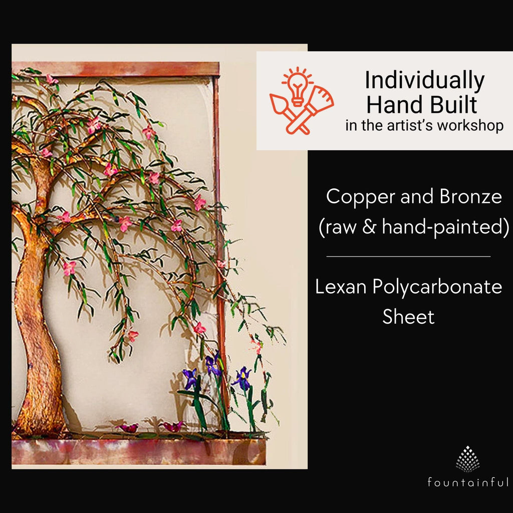 The tree is made entirely of copper and bronze with painted and colored leaves and flowers. It sits in front of a sheet of clear Lexan that the water flows behind. In the basin are life-sized copper irises, lily pads, and lotus flowers.