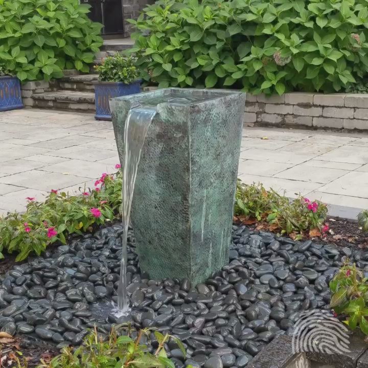 The Tapered Square Brass Urn Fountain from Blue Thumb Fountains is a beautifully hand-molded brass vessel that's been finished in a striking aqua-colored patina. Water pours over the spout into the garden below in a perpetually flowing stream, creating a beautiful singular focal point of sight and sound.