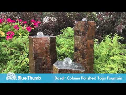 The Triple Polished Top Basalt Fountain by Blue Thumb boasts natural basalt blocks hand-chiseled into columns of varying heights. The bottoms are saw-cut to sit flat, while the tops are polished smooth for a textural contrast.