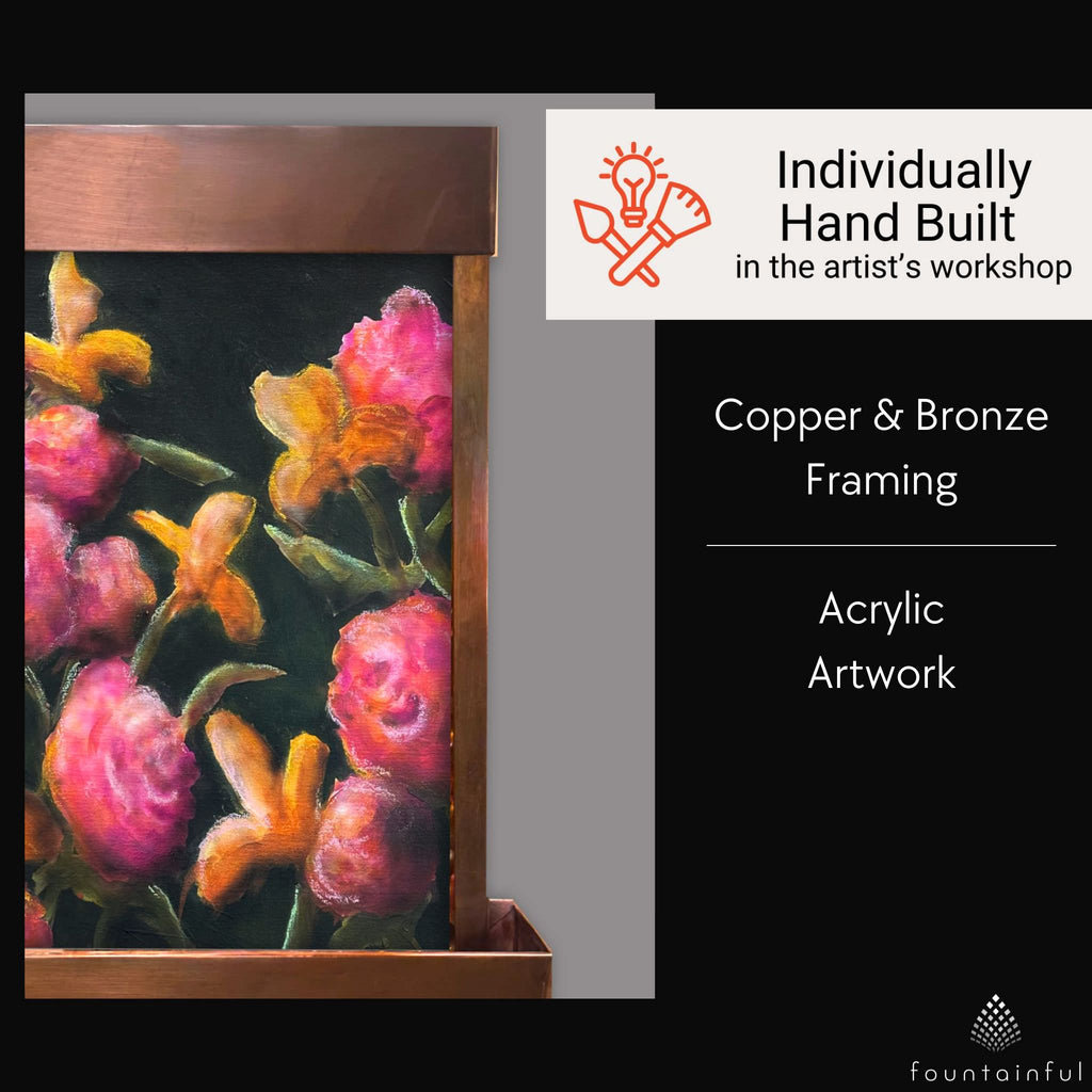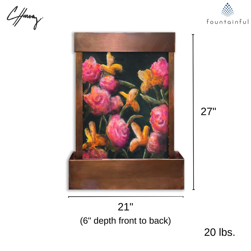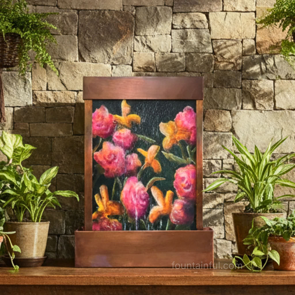 The Velvet Bloom Tabletop Fountain by artist Cameron Harvey depicts lovely stems and flowers in an impressionist style. A lovely fountain for the romantic in your life. The backsplash is acrylic, while the copper and bronze trim offer versatile placement options whether your décor is modern, rustic, or neutral.